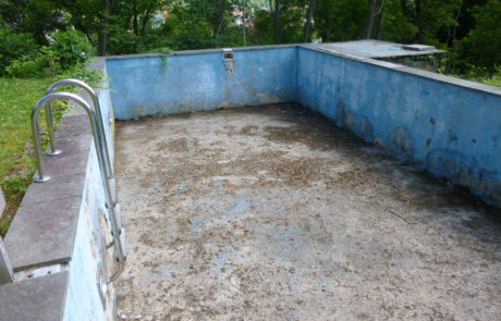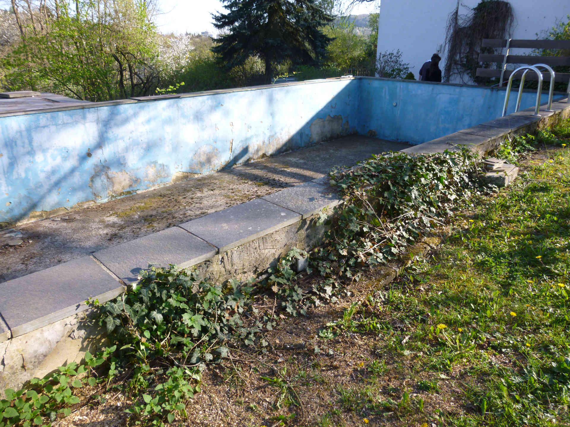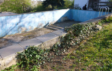 Der alte Gartenpool ist unbrauchbar geworden. Er nimmt viel Platz im Garten ein und ist keine Augenweide. Bei der Gartensanierung soll eine moderne Terrasse das alte Ungetüm ersetzen.